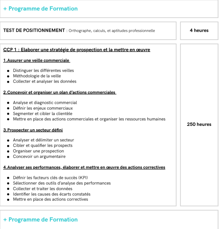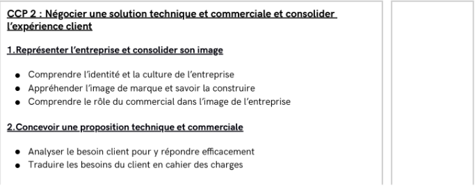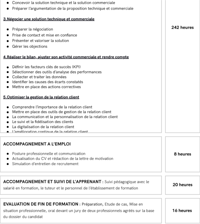 À la fin de cette formation, vous serez en mesure d’assurer une veille commerciale, de concevoir et d’organiser un plan d’actions commerciales, de prospecter, d’analyser vos performances et de mettre en place des actions correctives. Vous apprendrez également à représenter l’entreprise et à valoriser son image, à concevoir une proposition technique et commerciale, à négocier une solution technique et commerciale et à optimiser la gestion de la relation client.